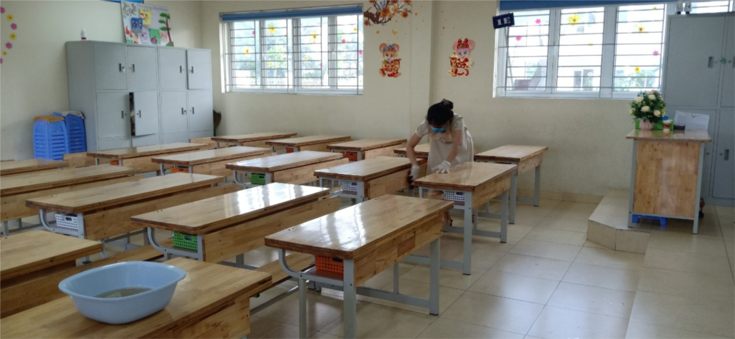 16 giờ 30 phút ngày/5/2020, sau khi bàn giao học sinh về với bố mẹ xong, tập thể cán bộ giáo viên, nhân viên tiến hành tổ chức tổng vệ sinh, phun khử khuẩn trường, lớp học lau dọn lớp học, bàn ghế, hành lang, phòng làm việc, khu vệ sinh, ngoại cảnh, đồ dùng dạy học ... toàn bộ khung cảnh sư phạm môi trường sạch sẽ, an toàn để phòng chống dịch bệnh Covid - 19.