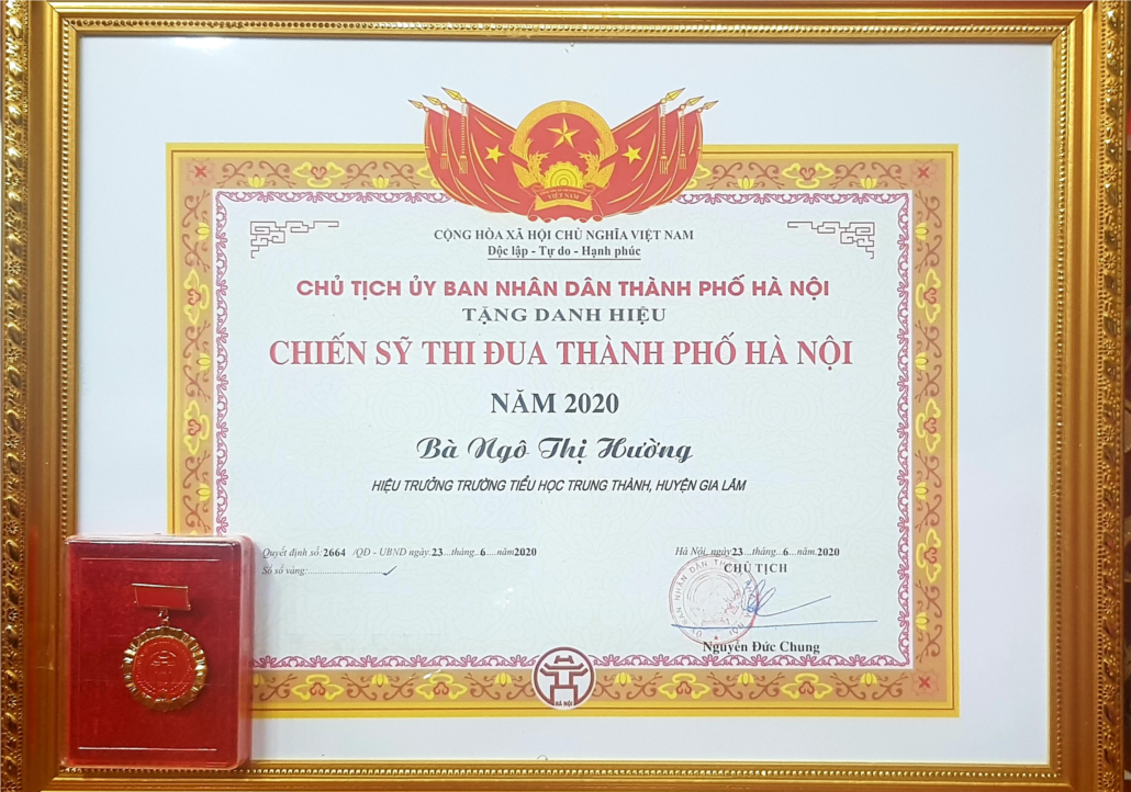 Tại buổi Lễ, cô Ngô Thị Hường - Bí thư chi bộ - Hiệu trưởng trường Tiểu học Trung Thành đã vinh dự được Chủ tịch UBND thành phố Hà Nội tặng danh hiệu Chiến sỹ thi đua thành phố Hà Nội năm 2020.