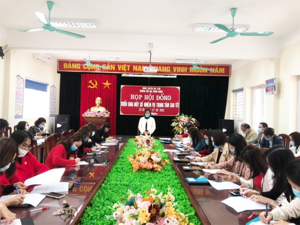 Ngày 17/02/2021 trường Tiểu học Trung Thành tổ chức họp hội đồng triển khai một số nhiệm vụ trong tâm sau tết. Tại buổi họp đồng chí Hiệu trưởng đã triển khai một số nhiệm vụ trọng tâm. Tiếp sau đồng chí phó hiệu trưởng triển khai kế hoạch tổ chức dạy học qua internet cho học sinh trong thời gian nghỉ phòng, chống dịch bệnh covid-19.